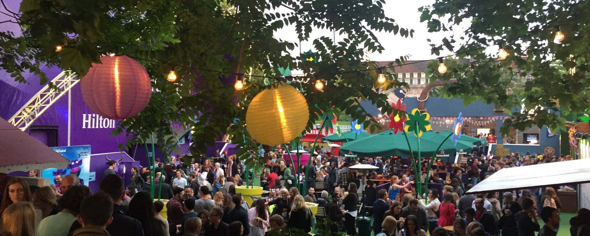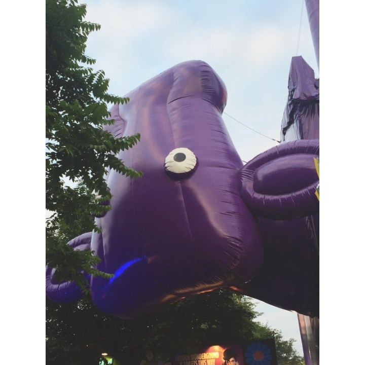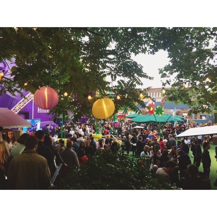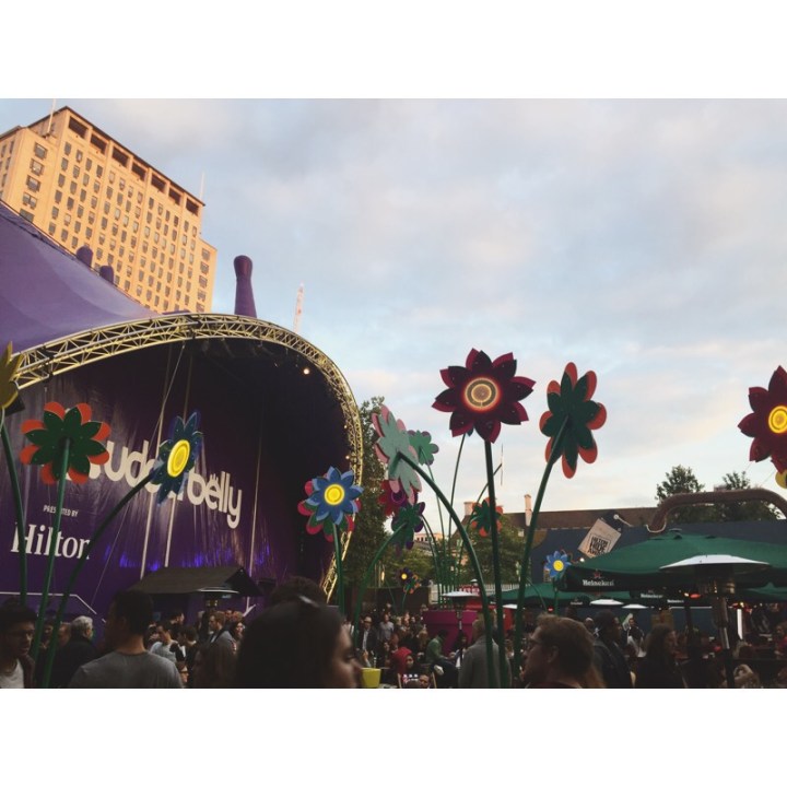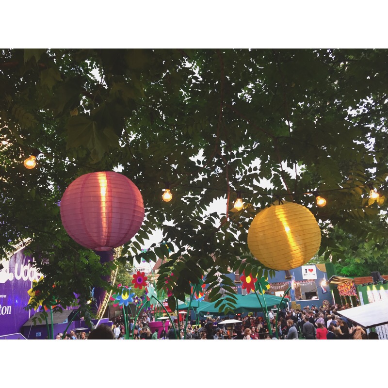 The bar next to Violet the giant purple upside down cow serves beer, cider, wine and Pimms (which was a bit steeply priced for my liking, but where isn’t in London I guess) along with offering some street food too. It is decorated with beautiful lanterns and flowers hanging from the sky, and is full of different seating areas, which are lit with pretty fairy lights when the sun starts to set. However, his area tends to get super packed and on Saturday we timed our arrival with the start of a show, which meant it was extra busy.