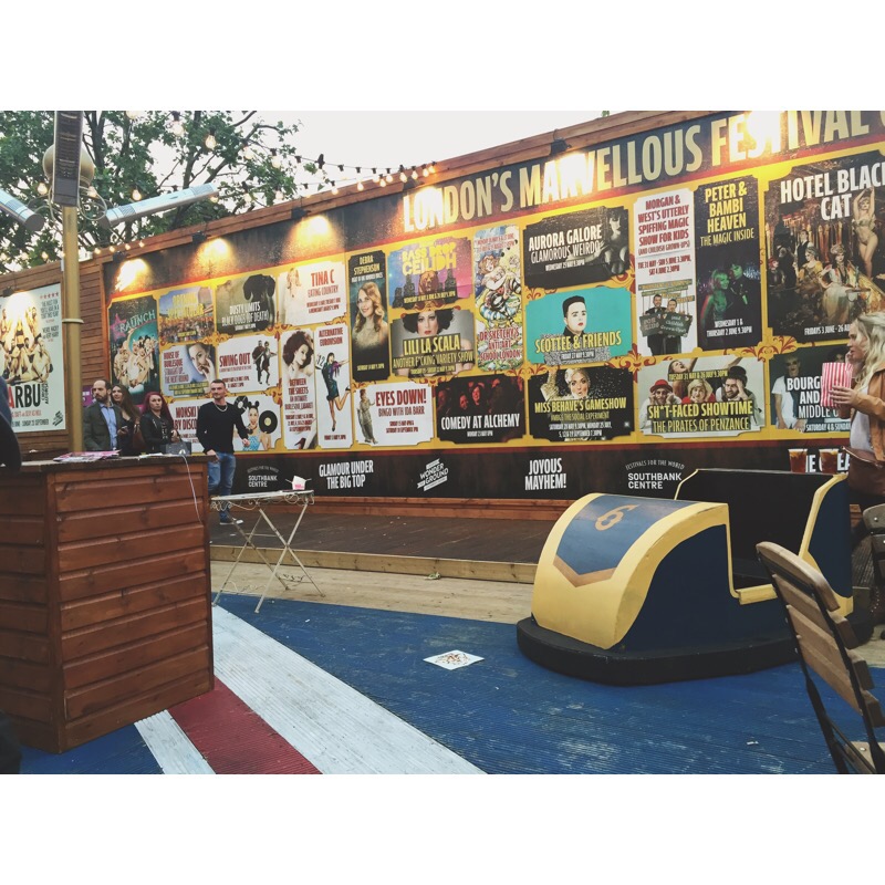 We got our drinks and decided that we would give up hope of trying to get a seat in the main Udderbelly area and instead try and find a seat in the Wonderground area – to our surprise, it was pretty empty! It’s hidden behind the cow so perhaps not as many people know its there, and luckily for us we got a seat in one of the dodgem style tables which are really fun. This area is themed like a fairground and as well as dodgem style seats, there are waltzer car style seats too with a circus tent at the far end which hosts all of the Wonderground shows and performances.