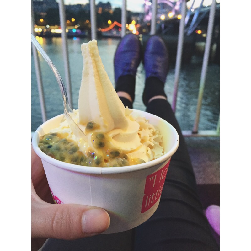 We sat and had a drink for a while until we decided to go for a walk along the river while there was a little bit of daylight remaining. We didn’t get far before we were stopped in our tracks by the bright pink Snog frozen yoghurt bus, which is always too tempting to pass up. There were a couple of free deckchairs right on the river in view of the Houses of Parliament so we grabbed a fro-yo and sat and ate them looking across the Thames which was so lovely. I had mango with passion fruit and white chocolate stars, and my Jake had coconut with strawberry and white chocolate stars.